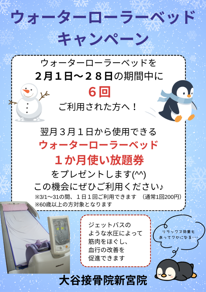ウォーターローラーベッドキャンペーンのお知らせ お知らせ 2026.01.28 60歳以上の方へお得なキャンペーンのお知らせです 2月1日から2月28日の期間中にウォーターローラーベッドを6回ご利用くださった方へ 翌月3月1日から3月31日までウォーターローラーベッド1日1回使い放題券をプレゼントいたします♪ この機会にぜひご利用くださいませ(^^)