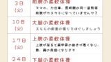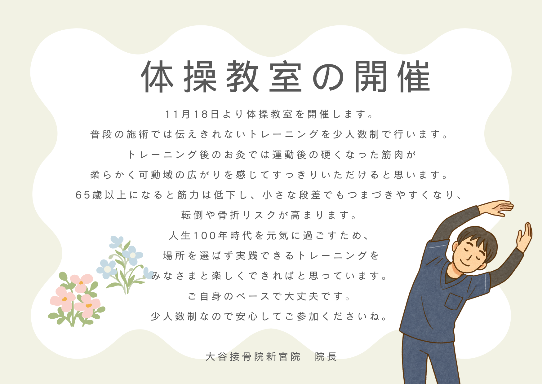 体操教室の開催 体操教室の予定 2026.01.28 毎週火曜日 14:30~15:00 60歳以上の方を対象に体操教室を開催しております。 普段の生活だけでは、筋力は年々低下していきます。ぜひトレーニングの習慣をつけましょう! 少人数制で、お一人お一人に合わせて無理のない範囲で行います。 ストレッチの後に、お灸をサービスさせていただきます。 体操の内容は毎回変更しますので、院内やホームページで内容を掲載いたします。 回数券も販売しております。10回券→9000円 予約制になっております。ぜひお声がけくださいね(^^)